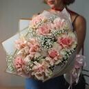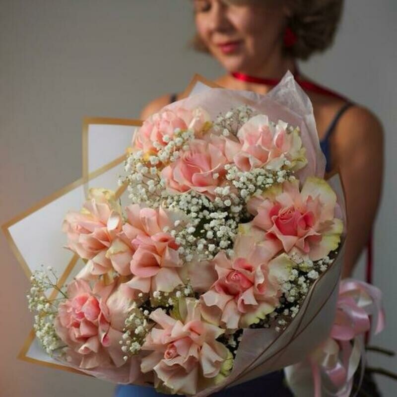 Iziskannij buket iz 9 frantcuzskih roz i gipsofili