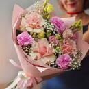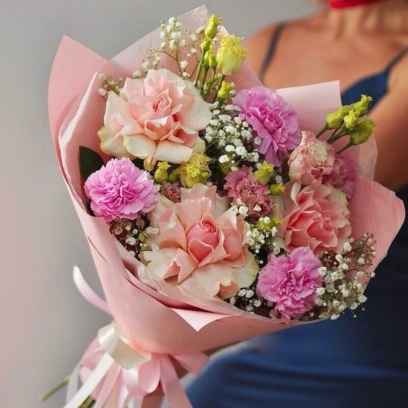 SHikarnij buket iz 3 frantcuzskih roz, eustomi, gvozdiki i gipsofili