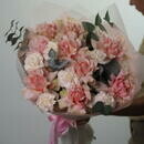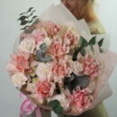 Vozdushnij buket iz frantcuzskoj rozi, gvozdiki i evkalipta