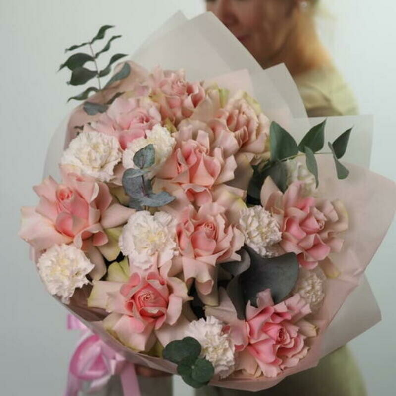 Vozdushnij buket iz frantcuzskoj rozi, gvozdiki i evkalipta, standart