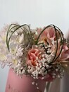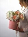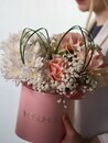 Kompozitciya v korobke: frantcuzskaya roza, hrizantema i gipsofila