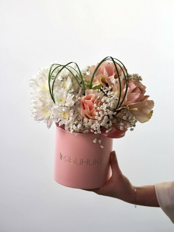 Kompozitciya v korobke: frantcuzskaya roza, hrizantema i gipsofila, standart