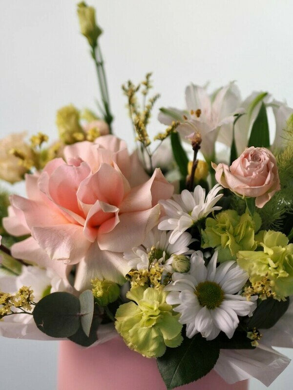 TCveti v korobke: eustoma, roza kustovaya i diantus