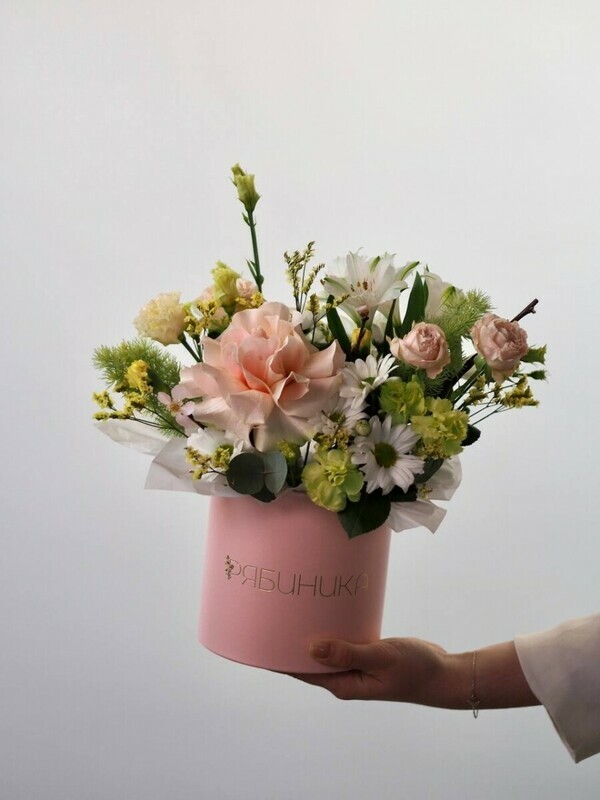 TCveti v korobke: eustoma, roza kustovaya i diantus, standart