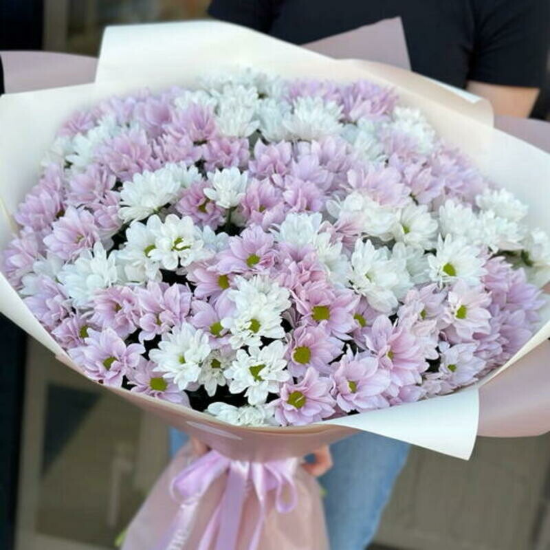 Etot buket — voploshenie nezhnosti i garmonii. Pyatnadtcat_ pushistih sotcvetij kustovih hrizantem spletayutsya v vozdushnoe oblako, gde nezhnie rozovie tona perelivayutsya v chistie, kak pervij sneg, belie. Kazhdij tcvetok, kak malen_koe solntce s mnozhestvom lepestkov, sozdaet oshushenie uyuta, tepla i bezmyatezhnosti. Buket govorit na yazike iskrennih chuvstv, simvoliziruya radost_, vernost_ i pozhelanie dolgih svetlih dnej.