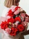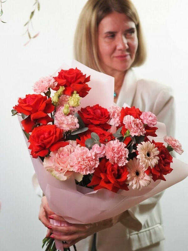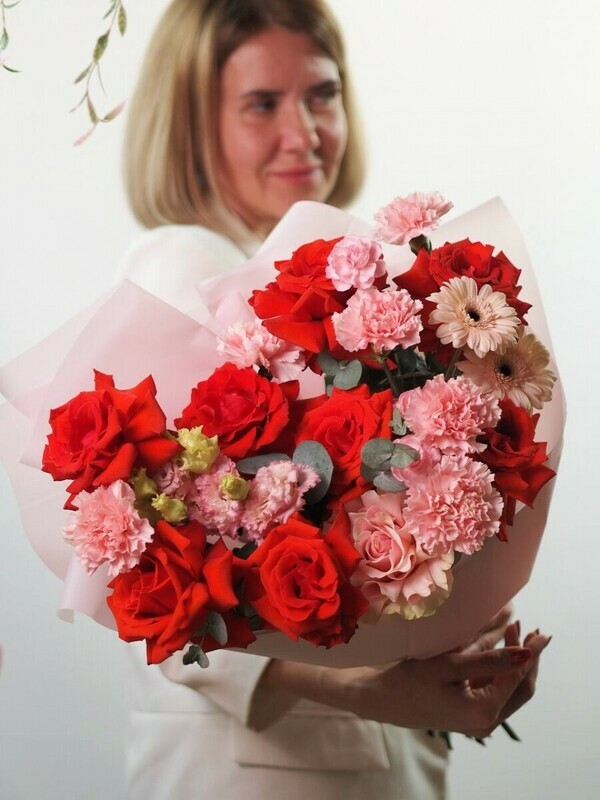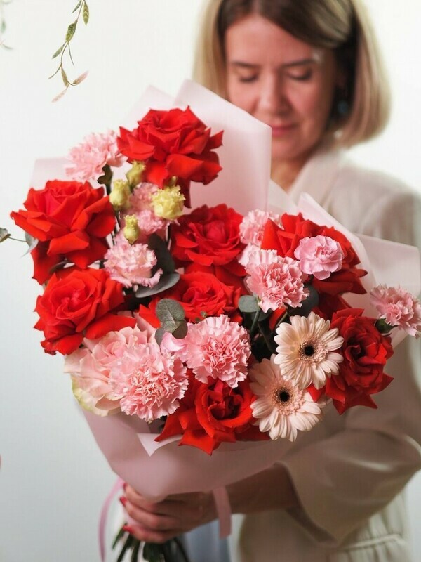 Devyat_ alih frantcuzskih roz sozdayut strastnoe serdtce kompozitcii, simvoliziruya glubinu chuvstv. Dve nezhnie gerberi i sem_ iziskannih gvozdik dobavlyayut igrivosti i tepla. Odinochnaya eustoma, slovno zhemchuzhina, pridayot vozdushnuyu lyogkost_, a dve kustovie gvozdochki zavershayut obraz utonchyonnoj detalizatciej. Vetochki evkalipta daryat svezhest_ i estestvennost_.
