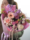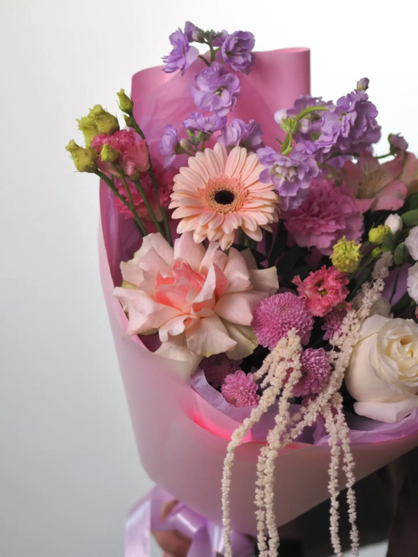 Nezhnij buket, ukutannij v dimchato-rozovuyu vual_ upakovki, slovno sokrovennoe poslanie ot vlyublyonnogo serdtca. Otlichnij vibor dlya svidaniya, priznaniya v lyubvi ili romanticheskogo syurpriza. Nezhnaya pastel_naya gamma v romanticheskih tonah — lavandovij, persikovij, rozovij, kremovo-belij i sirenevij ottenki sozdayut vozdushnuyu i mechtatel_nuyu kompozitciyu.