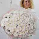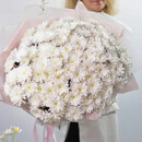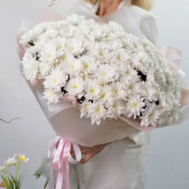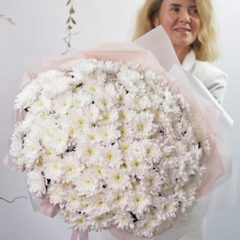 Etot roskoshnij buket slovno sotkan iz zimnej svezhesti i pervogo snega. Dvadtcat_ odna belosnezhnaya hrizantema slivaetsya v edinoe pishnoe oblako, kotoroe hochetsya derzhat_ v rukah beskonechno. Belie hrizantemi perelivayutsya myagkim zhemchuzhnim siyaniem, a ih plotnie sotcvetiya obrazuyut sovershennuyu sferu — simvol garmonii i tcelostnosti.