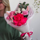 V tcentre kompozitcii — krupnaya pionovidnaya roza. Eyo barhatnie, nasishennie lepestki zadayut harakter vsemu buketu. YArkost_ glavnoj geroini myagko ottenyayut belie hrizantemi-pomponi, nezhnaya gvozdika i miniatyurnie kustovie rozi. Vetochki matovogo evkalipta i pushistie lagurusi dobavlyayut kompozitcii vozdushnosti i sovremennoj prirodnoj teksturi.