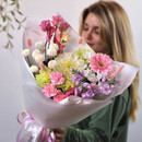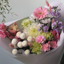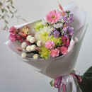 Etot buket — kvintessentciya kollektcii, gde nichego ne otvlekaet ot glavnogo: tekstur i sveta. V nyom pereplelis_ rozovaya gerbera i nezhnie lavandovie aktcenti, a vozdushnie lagurusi dobavlyayut tot samij modnij «dikij» shtrih. Upakovka iz plotnoj beloj bumagi rabotaet kak chistij holst, podcherkivaya sovremennij minimalizm kompozitcii.