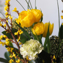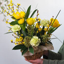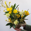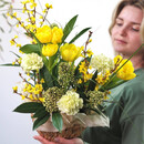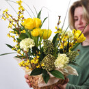 Eta kompozitciya — slovno kusochek vesennego solntca, berezhno ulozhennij v uyutnuyu pletenuyu korzinu. TCentral_noe mesto zanimayut pishnie mahrovie tyul_pani nasishennogo zheltogo tcveta. Oni napominayut malen_kie, sladkie butoni, raspuskayushiesya na utrennem rassvete. Ih yarkij tcvet podderzhivaetsya vetochkami forsajtii — hrupkimi zolotimi ogon_kami, kotorie ustremlyayutsya vverh, sozdavaya oshushenie zhivoj, dikoj prirodi.