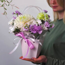 V tcentre kompozitcii — krupnaya belaya hrizantema s nezhnim zelyonim serdtcem, raskrivshayasya slovno zhemchuzhina. Eyo chistotu podderzhivayut vozdushnie belie romashki i svezhie zelyonie aktcenti, a lavandovie sotcvetiya dobavlyayut glubini i lyogkoj tainstvennosti.
