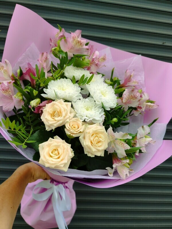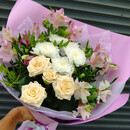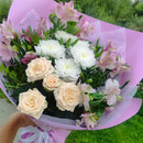 - Nezhnij buket iz kustovoj rozi,hrizantemi i al_stromerii