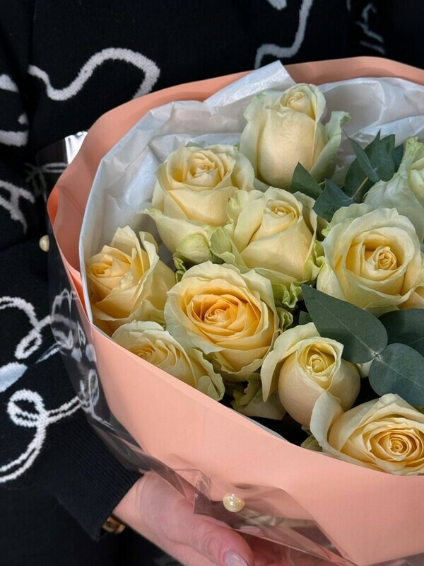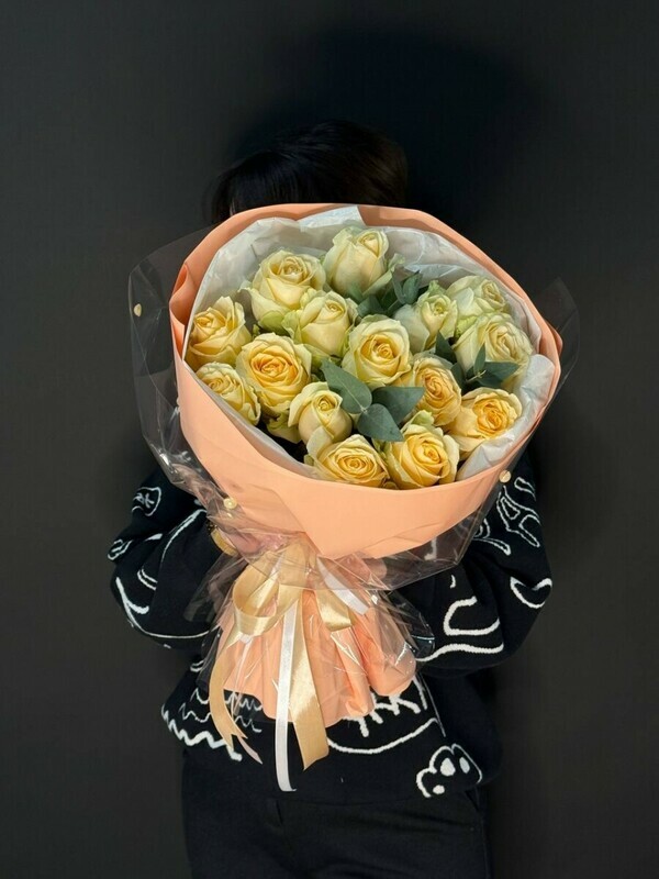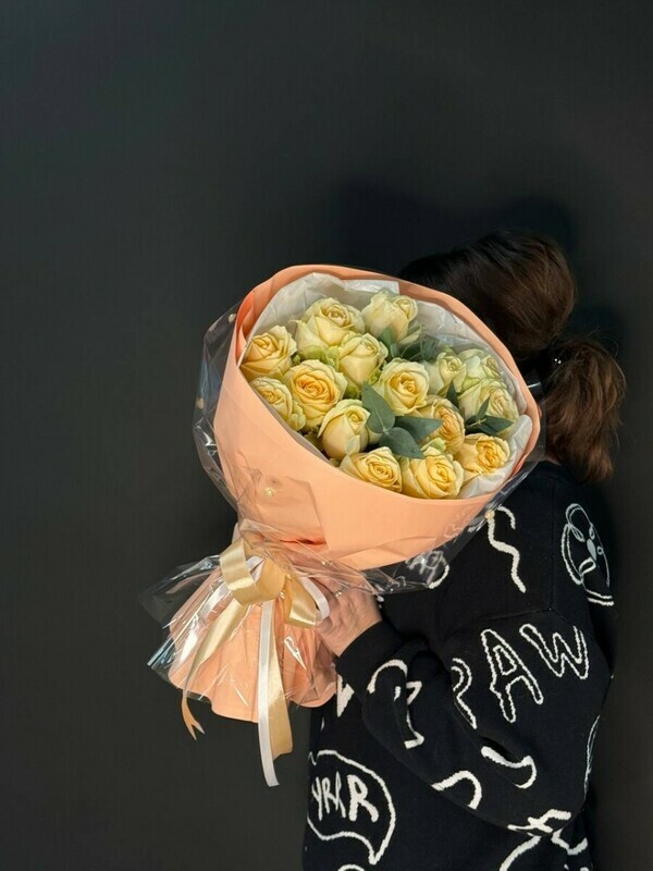 - 15 nezhnih persikovih roz v krasivom oformlenii