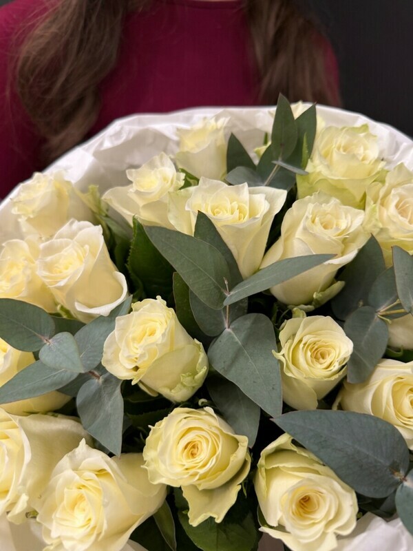 Belie rozi s evkaliptom v stil_noj upakovke, 19sht