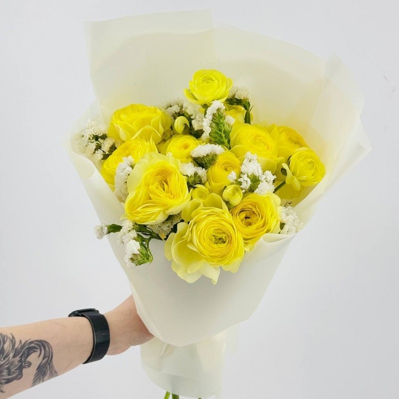 - ZHyoltie limonnie ranunkulyusi i statitca. YArkij buket na den_ rozhdeniya