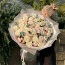 - Buket iz pionovidnoj kustovoj i odnogolovoj rozi s evkaliptom «Vlyublennij vzglyad»