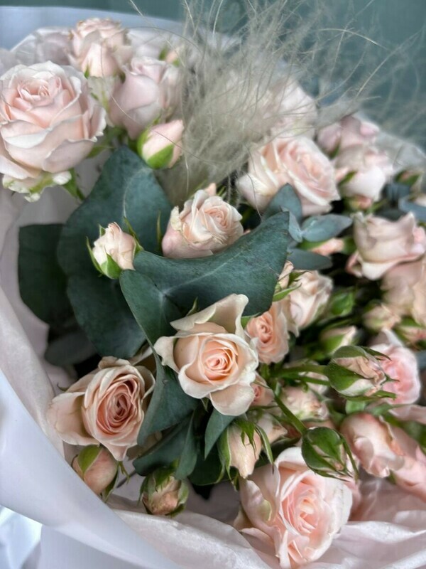 Roskoshnij buket iz nezhno-rozovih kustovih roz Polina, dopolnennij azhurnim evkaliptom i vozdushnim belim kovilem. Ideal_noe sochetanie romantiki, nezhnosti i prirodnoj gratcii dlya osobogo priznaniya. Etot elegantnij i stil_nij buket sozdast atmosferu legkosti i volnuyushej krasoti. Otlichnij vibor dlya podarka na den_ rozhdeniya, svidanie ili prosto chtobi podnyat_ nastroenie.
