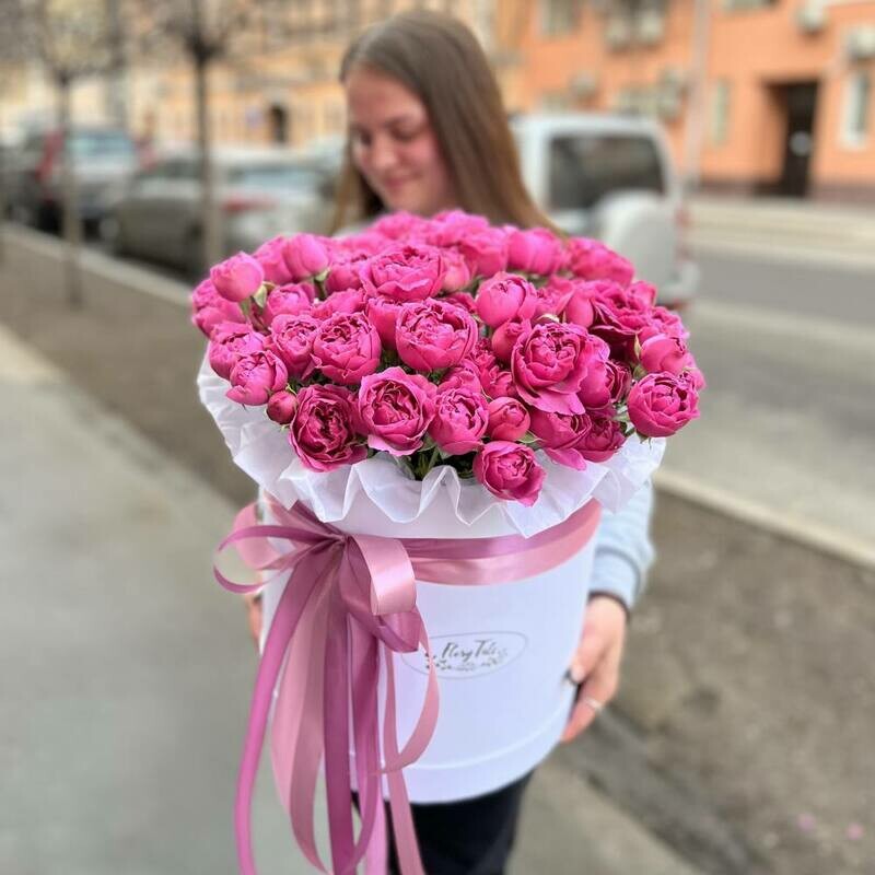 SHikarnij buket iz kustovih pionovidnih roz v korobe s gubkoj