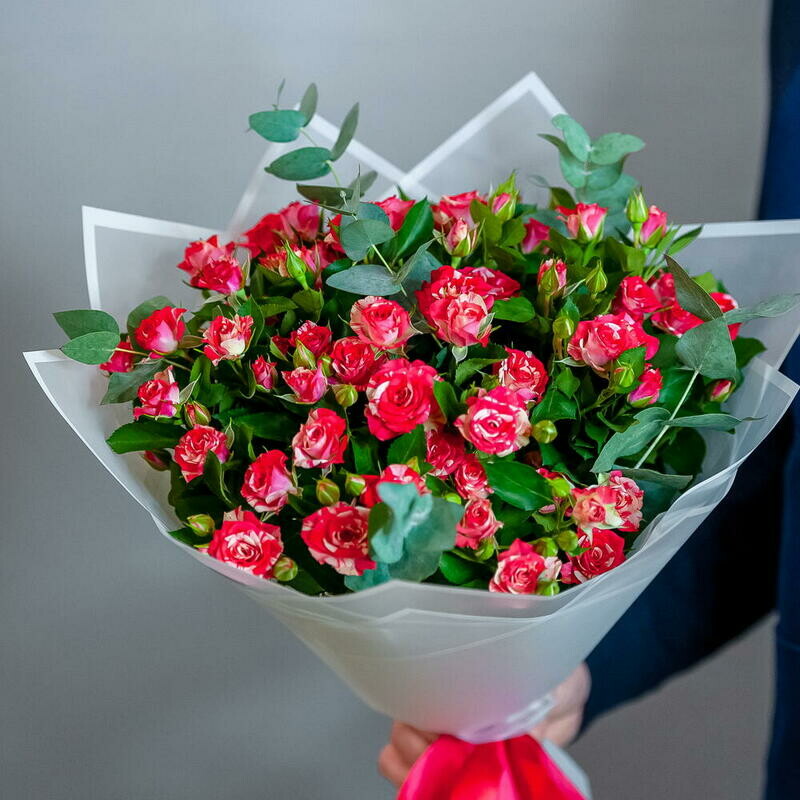 Buket yarkih kustovih roz v svetlom oformlenii 1679