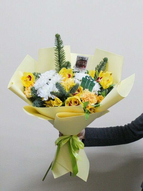 Potryasayushij buket v sochnih ottenkah tropicheskih fruktov! Orhidei tcimbidium, kustovie hrizantemi, gvozdiki i aromatnie vetochki nobilisa sozdayut nepovtorimoe sochetanie i pogruzhayut v atmosferu novogo goda v ekzoticheskoj strane!