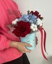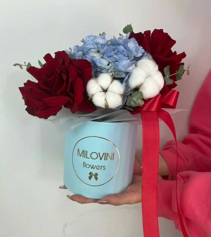 - TCveti v korobke s gortenziej, rozami i hlopkom
