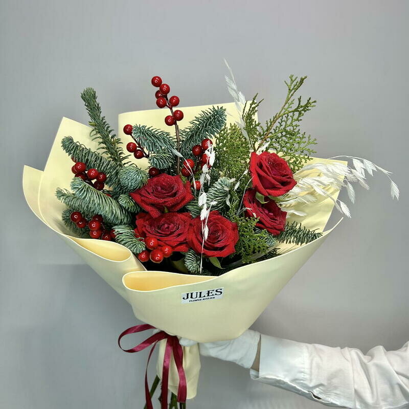 «Alaya svezhest_» buket iz nobilisa,tui,rozi red naomi,dekora i hasmantiuma