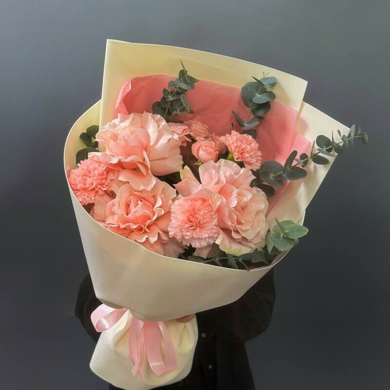 Roza Frantcuzskaya 3sht Roza kustovaya 1sht Diantus 3sht Evkalipt Upakovka