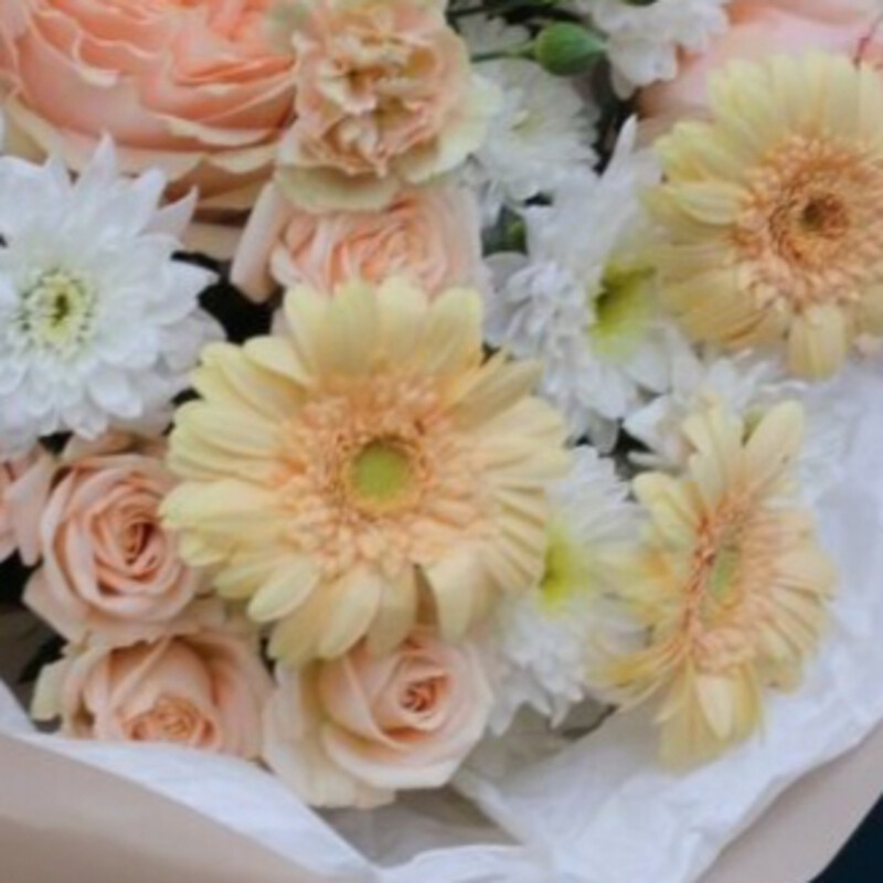 V bukete Sladkij persik nezhnie gerberi, slovno malen_kie solnishki, sogrevayut dushu odnim svoim vidom. Persikovie rozi, polnie strasti i zhizni, shepchut o lyubvi i nadezhde. Igrivie diantusi, dopolnyayushie etot yarkij horovod, dobavlyaet svezhesti i lyogkosti, napominaya o prohladnom utre v pole, polnom rosi.