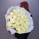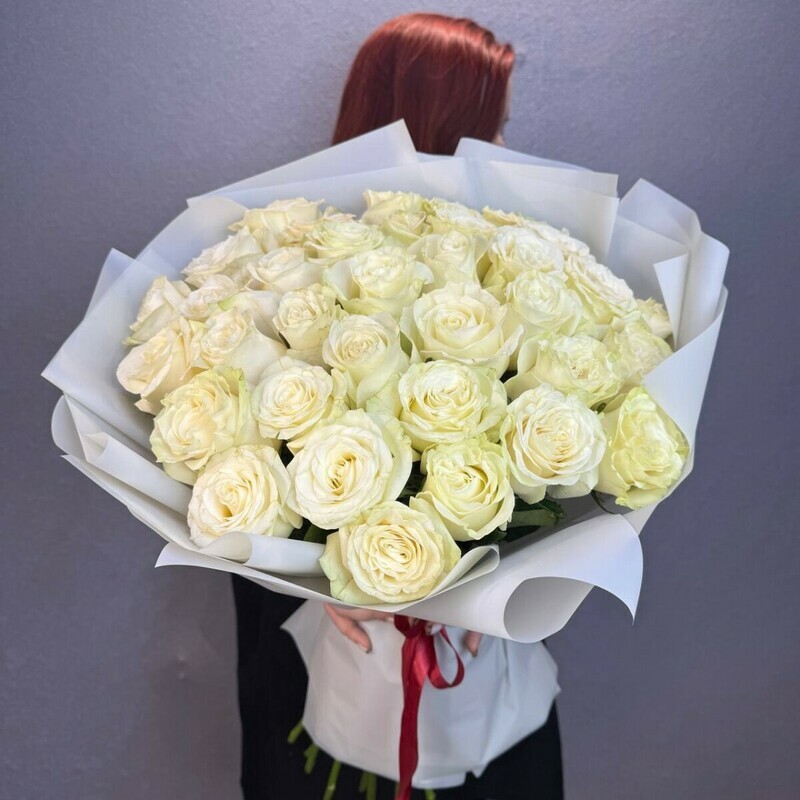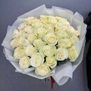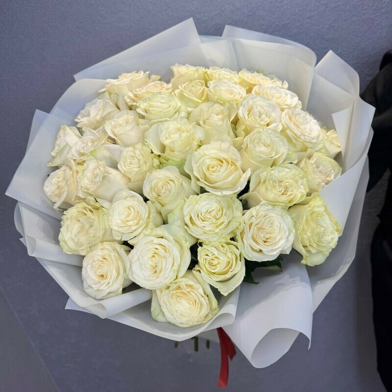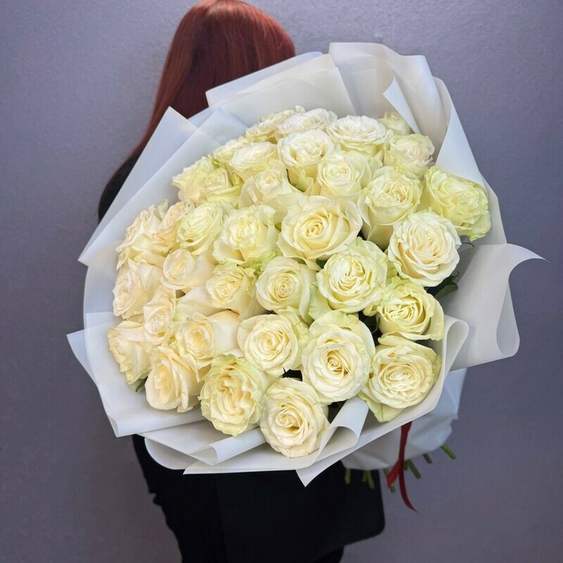 Pered vami iziskannij buket iz 35 belosnezhnih roz, voploshayushij soboj elegantnost_ i utonchyonnost_. Pishnaya kompozitciya viglyadit torzhestvenno i v to zhe vremya ochen_ nezhno — ideal_nij vibor dlya osobih sluchaev.