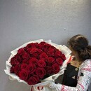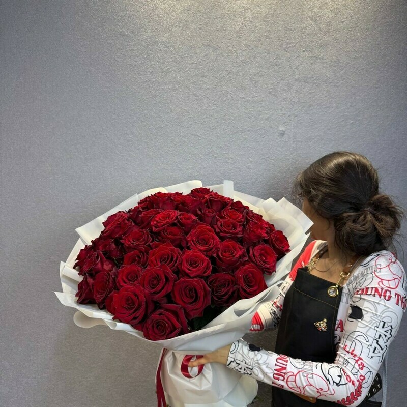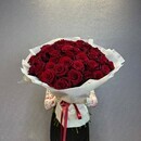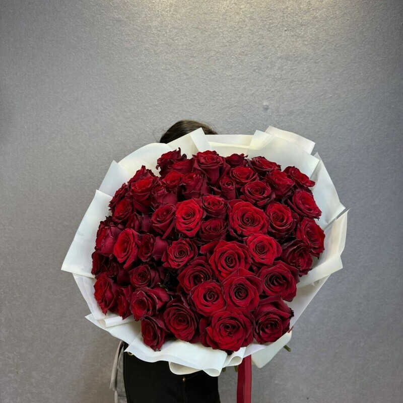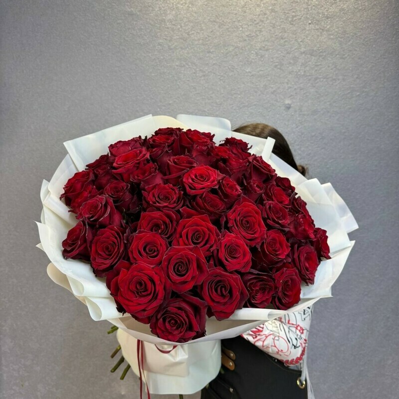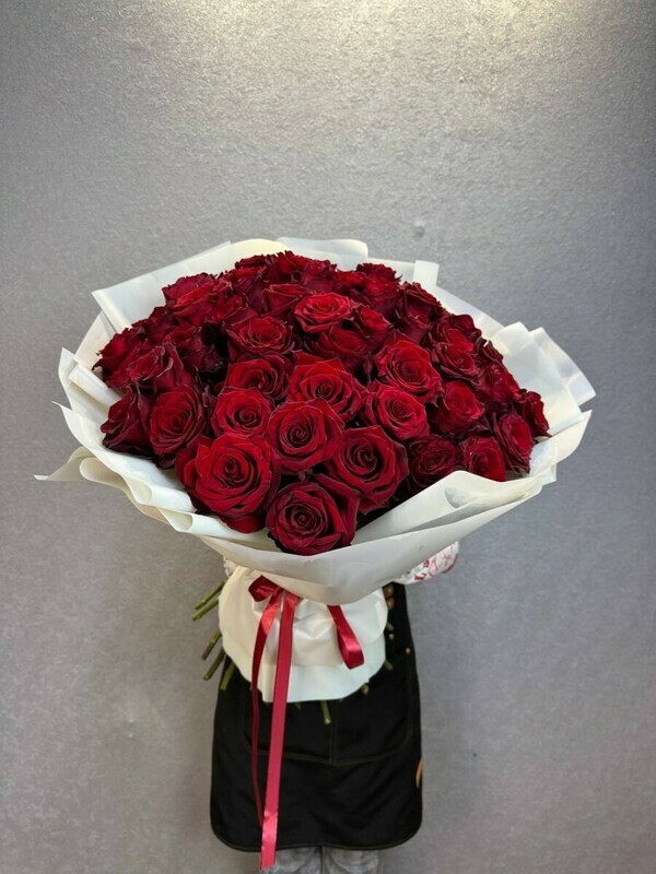 Pered vami roskoshnij buket iz 51 tyomno-krasnoj rozi, voploshayushij v sebe vsyu glubinu chuvstv i elegantnost_. Pishnaya kompozitciya, oformlennaya v iziskannoj beloj upakovke s atlasnoj lentoj, viglyadit torzhestvenno i velichestvenno. Nasishennij bordovo-krasnij ottenok roz sozdayot virazitel_nij aktcent, a akkuratnaya upakovka podchyorkivaet utonchyonnost_ buketa.