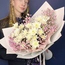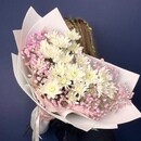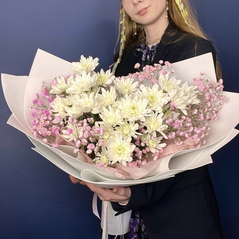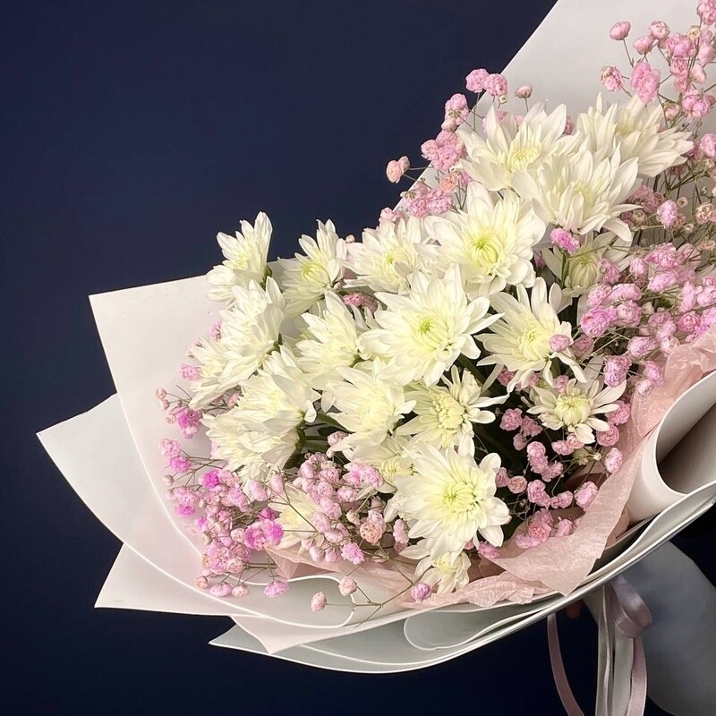 - Nezhnij buket s hrizantemoj i gipsofiloj rozovoj