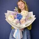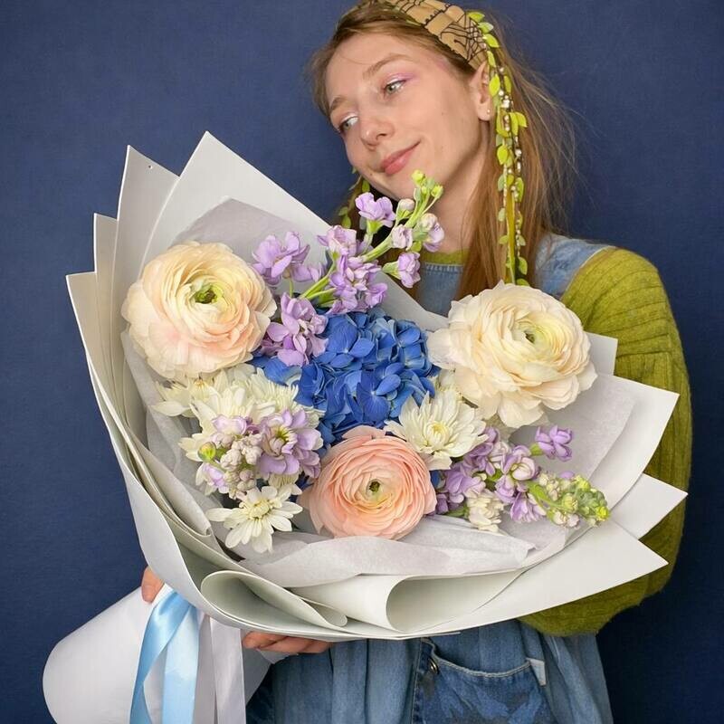 Premium pastel_nij buket «Blue Elegance» s gortenziej i ranunkulyusami