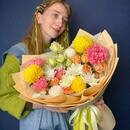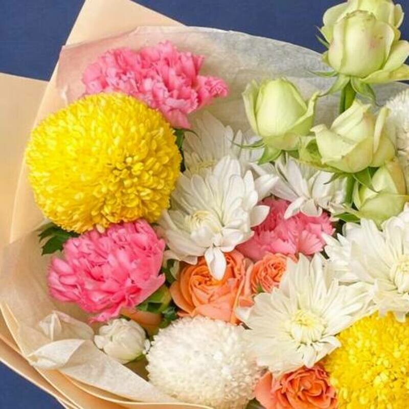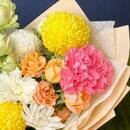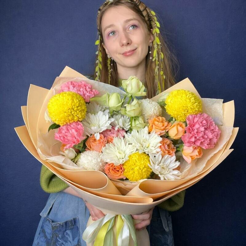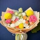 - YArkij zhyolto-rozovij buket «Sunny Charm» s rozami i hrizantemami