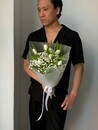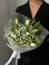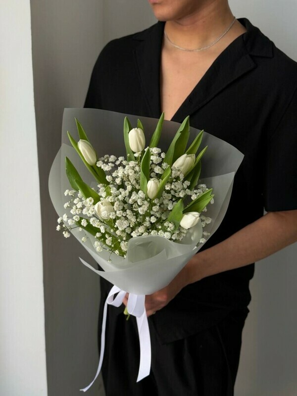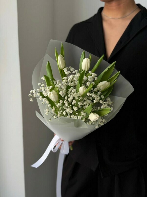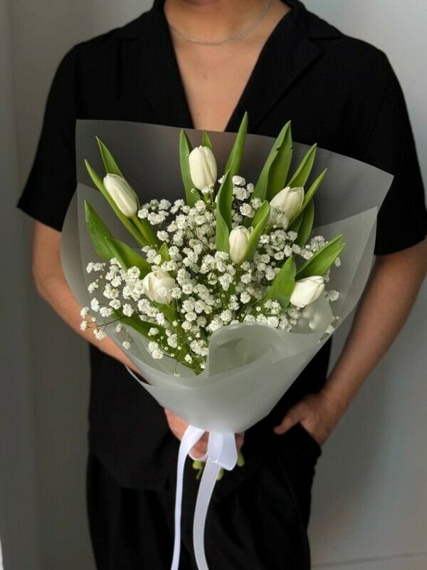 Samoe nezhnoe i trogatel_noe vesennee sochetanie, kotoroe nikogda ne vihodit iz modi. Hrustyashie belie tyul_pani, slovno utopayushie v vozdushnom oblake melkih tcvetochkov gipsofili, sozdayut oshushenie legkosti, chistoti i prazdnika.