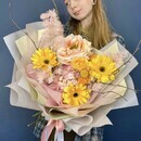 - Vesennij buket s gerberami, pion rozoj i gortenziej