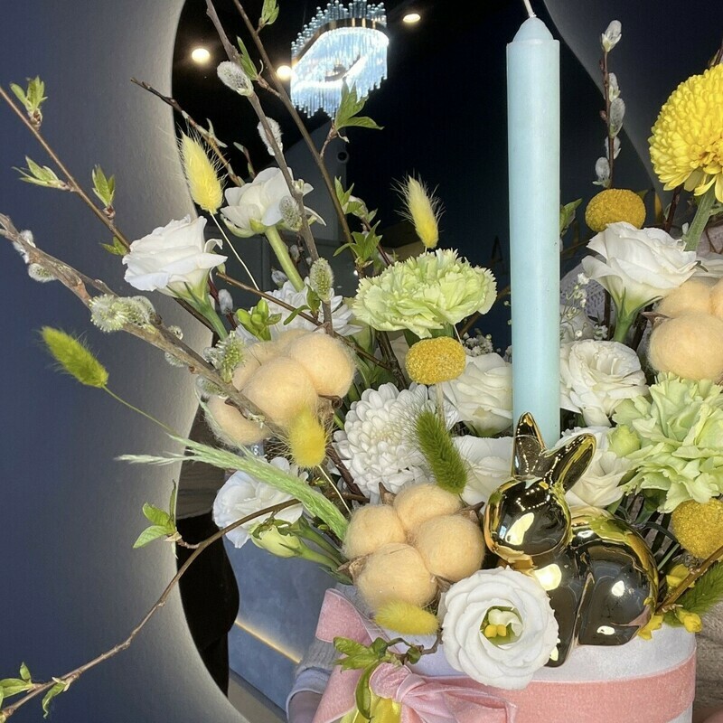 "Pashal_noe utro" kompozitciya s verboj, kraspediej, hlopkom i tcvetushimi vetkami v barhatnoj korobochke