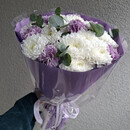 - Duobuket "Na sirenevoj lune", hrizantemi i diantusi, sbornij, belij, fioletovij