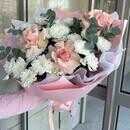 Buket iz nezhnih frantcuzskih roz, kustovih hrizantem i evkalipta