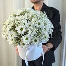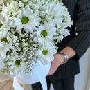 Bolshaya kompozitciya v shlyapnoj korobke s romashkami i beloj gipsofiloj