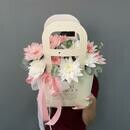 Kompozitciya iz belih i rozovih kustovih hrizantem s ekvaliptom v kartonnoj sumochke