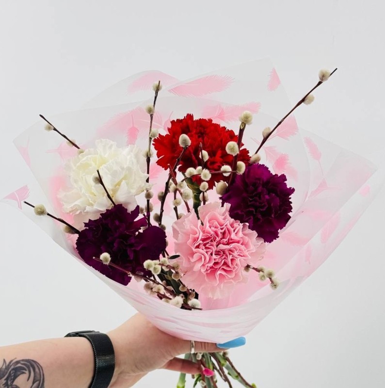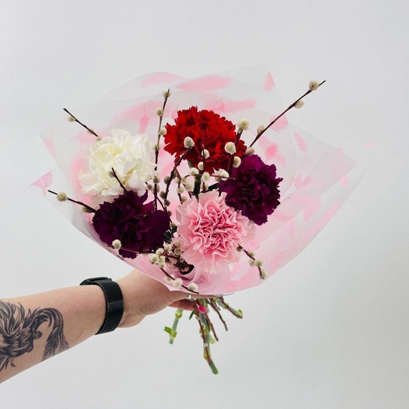 Buket iz 5 gvozdik s vetochkami verbi v dizajnerskoj upakovke. Raznotcvetnie diantusi, standart