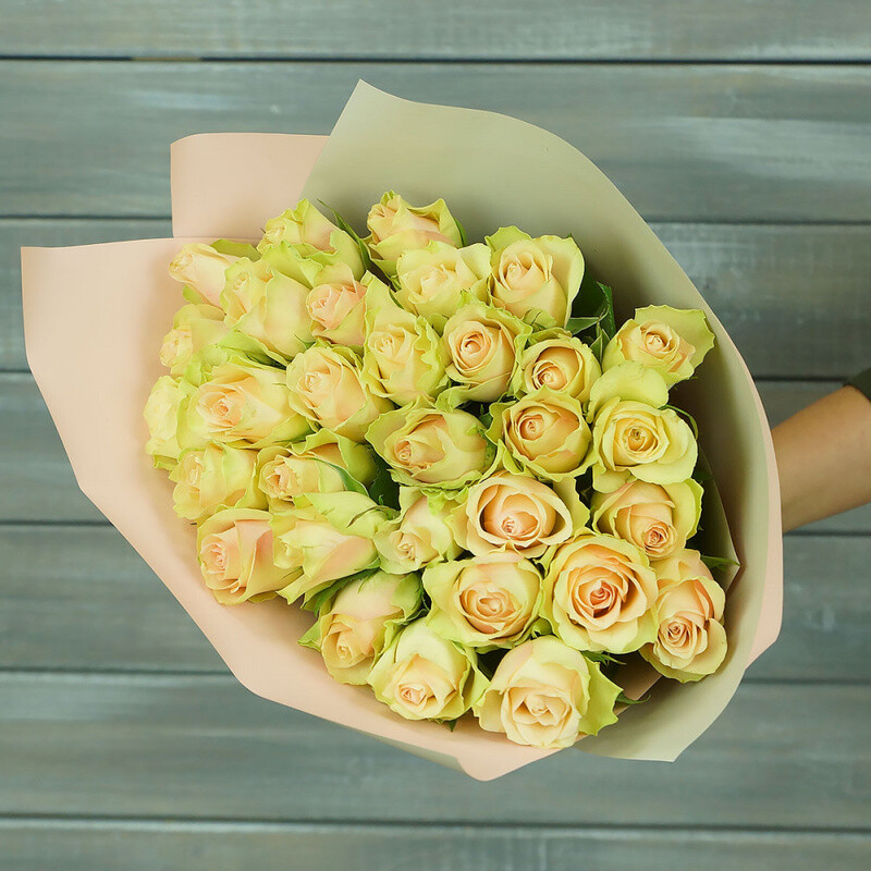 31 zeleno-rozovaya roza v upakovke Keniya 40 sm.