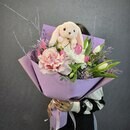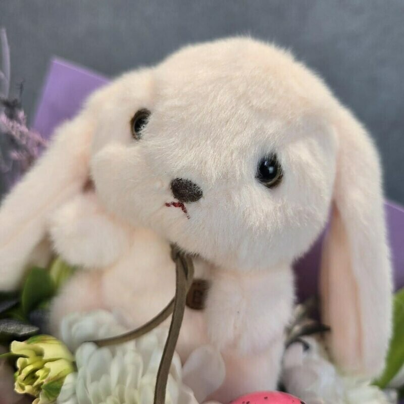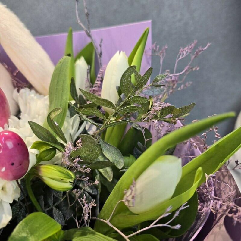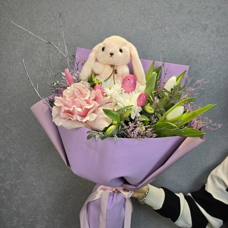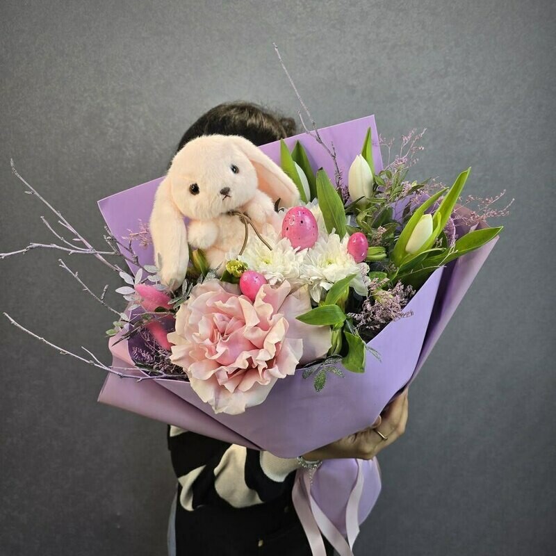 V etom bukete spletayutsya vesna i detstvo: nezhnie tcveti shepchut o probuzhdenii prirodi, a pushistij zajchik prinosit s soboj volshebstvo skazochnogo mira. Pastel_nie ottenki i yarkie aktcenti sozdayut garmoniyu, kotoraya sogrevaet dushu. Pust_ etot buket prinesyot radost_ i napolnit den_ svetom!