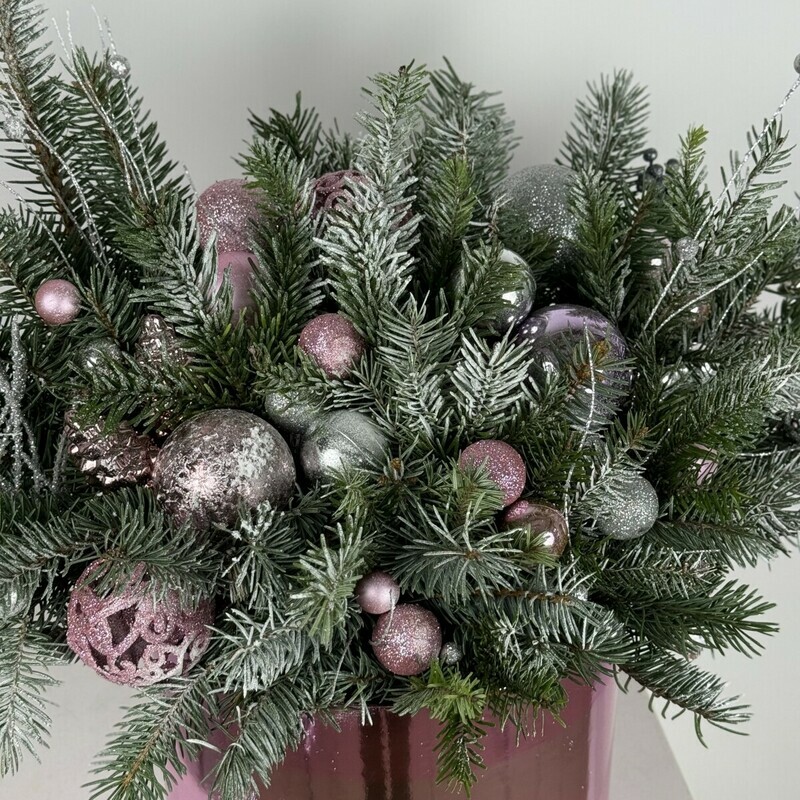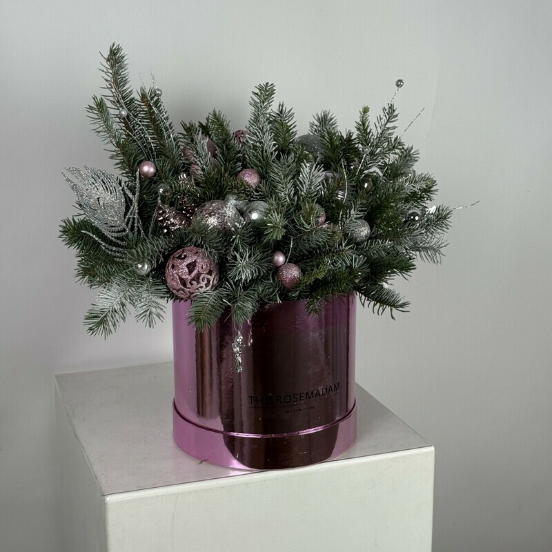 - Novogodnyaya kompozitciya v shlyapnoj korobke rozovoe zoloto
