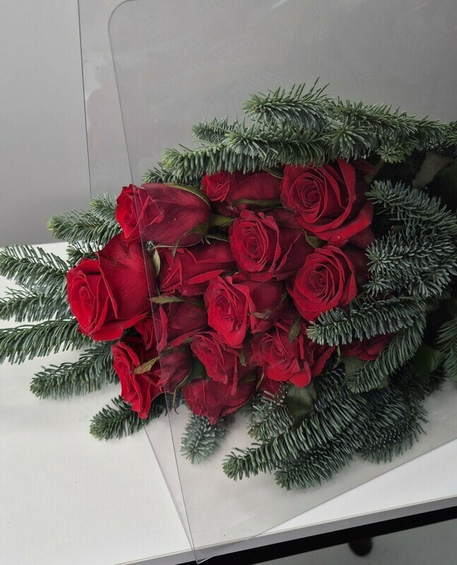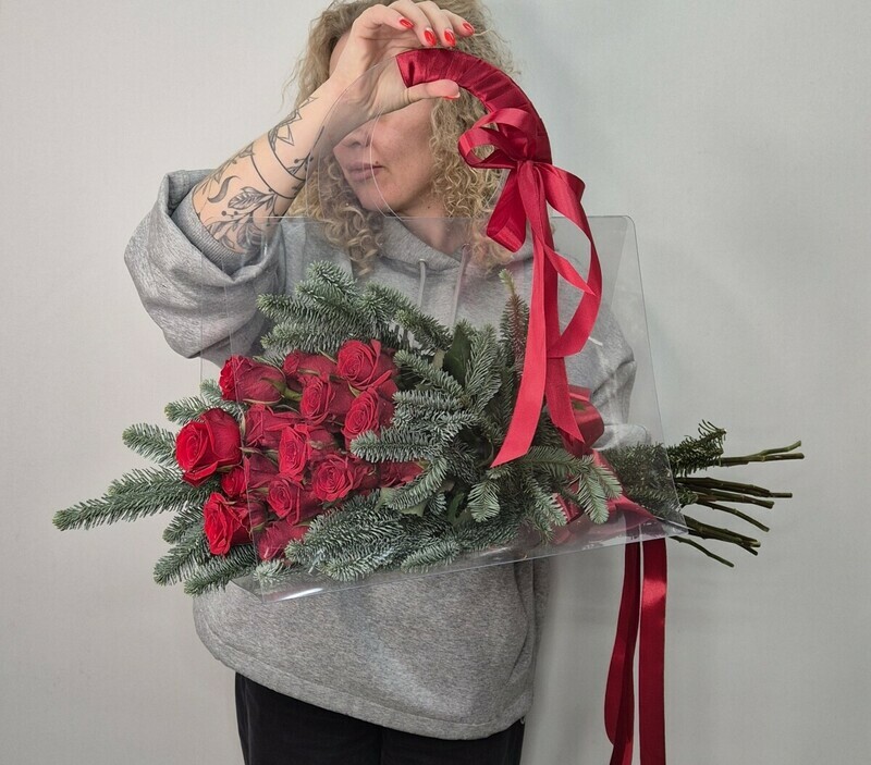 Rozi i vetochki yolki v stil_noj prozrachnoj sumke