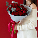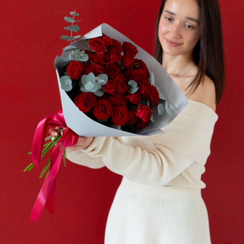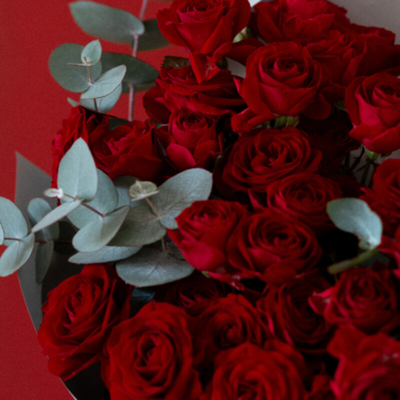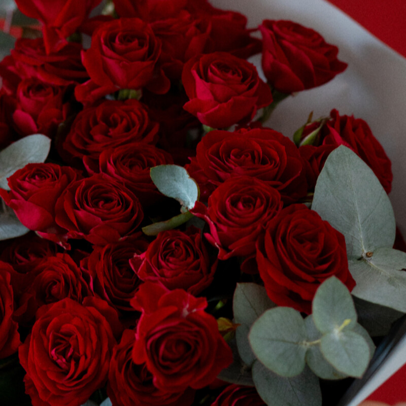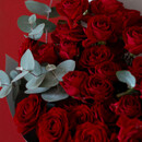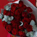 Monobuket iz krasnih kustovih roz s evkaliptom