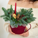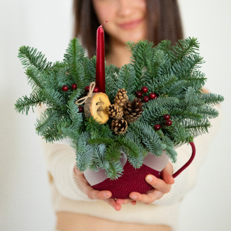 Atmosfernaya kompozitciya iz nobilisa s novogodnimi ukrasheniyami