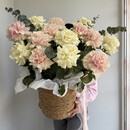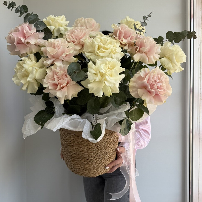 - SHikarnaya korzina s frantcuzskimi rozami i evkaliptom