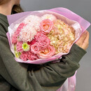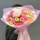 - Nezhnij buket s gortenziej, rozami, diantusami i hrizantemami